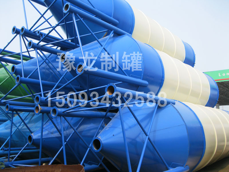 水泥罐为圆柱形结构,底部由四条圆管支腿支撑整个仓体,整仓全部为钢结构形式,焊接而成;顶部设有除尘器及压力安全阀。